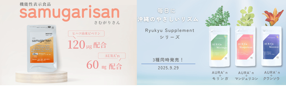 2025年9月29日(月)機能性表示食品「samugarisan」とRyukyuSupplementシリーズ「AURA'n+Moringa」「AURA'n+Manjericon」「AURA'n+Kwanso」をECサイト・公式LINEにて販売開始いたしました。 ◆オンラインサイト「SO+ ONLINE STORE」 ◆公式LINE「SO+ONLINE STORE」 ◆Instagram「SO+」