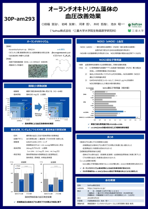 SoProsと三重大学・木村研究室のグループは、微細藻オーランチオキトリウムの血圧改善効果について「日本薬学会第144年会」でポスター発表しました。