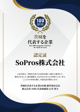 会社情報 · 2025/06/01 「茨城を代表する企業100選」に選出されました! 株式会社IOBIが運営する地方創生メディア「Made In Local」のメインコンテンツである「地域を代表する企業100選」の、茨城県に本社所在地がある厳選された限定100社の企業を紹介する取組「茨城を代表する企業100選」に選出されました。 SoPros株式会社「茨城を代表する企業100選」 tagPlaceholderカテゴリ:
